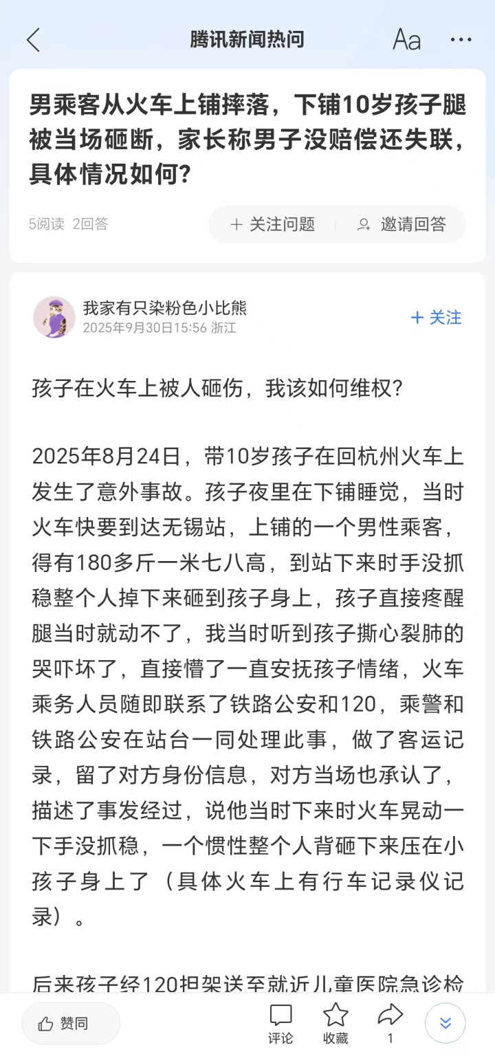 近日,朱女士在“腾讯热问”上发帖称,她今年8月底带着孩子乘坐火车时,一名男乘客从上铺摔落,砸到了睡在下铺的孩子的大腿,导致孩子股骨骨折。这名男乘客虽然陪同她们去了医院,但孩子做完手术后,对方表示手头没钱,要回去筹钱。